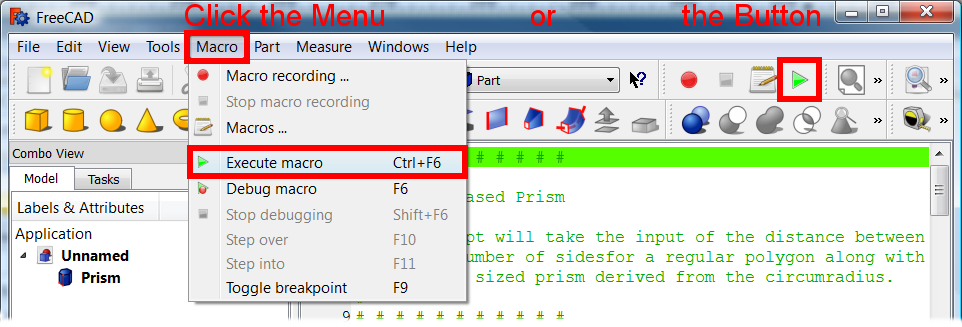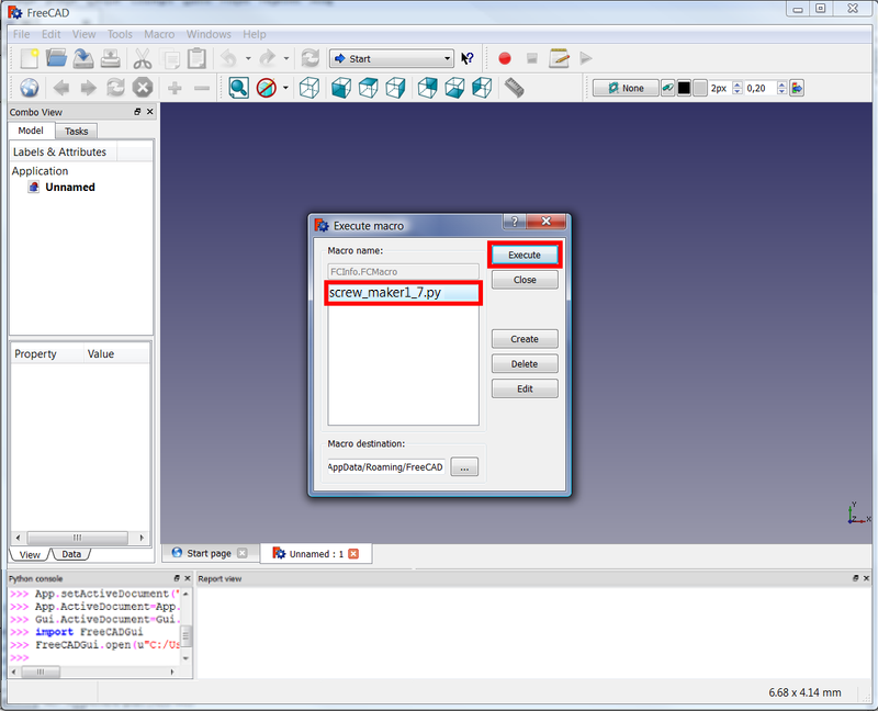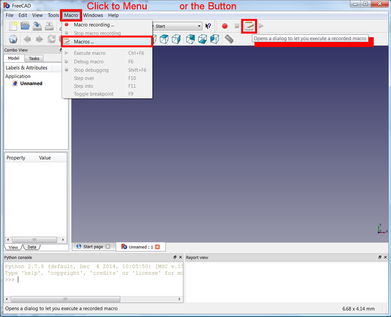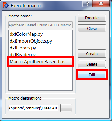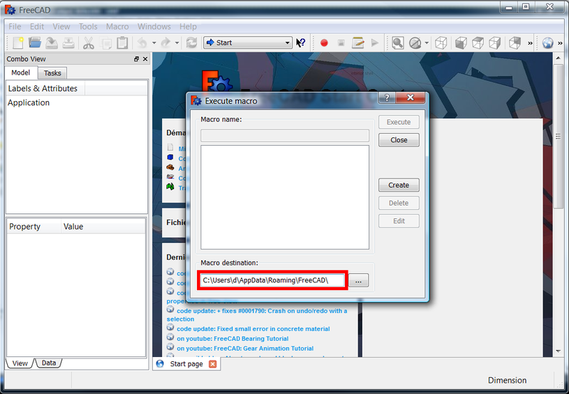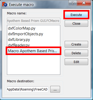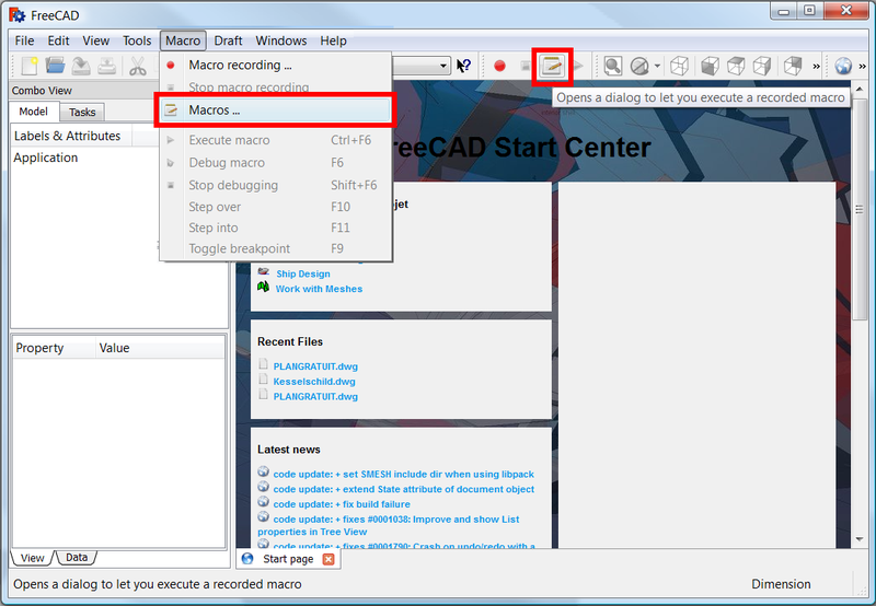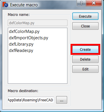 7. In FreeCAD, open the menu Macro → Macros... to open the Execute macro dialog.