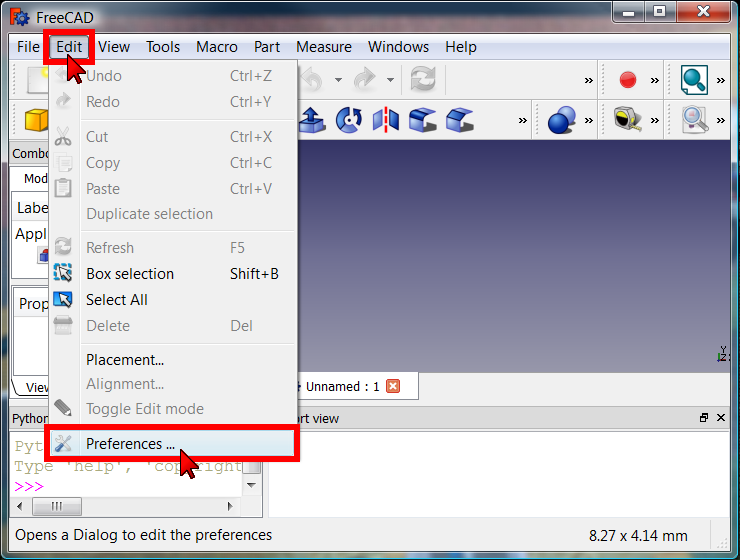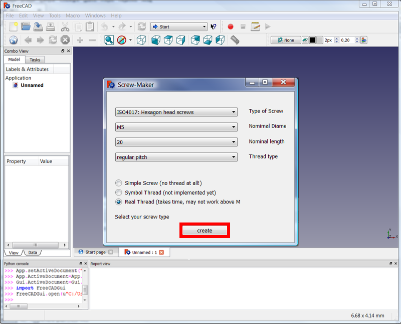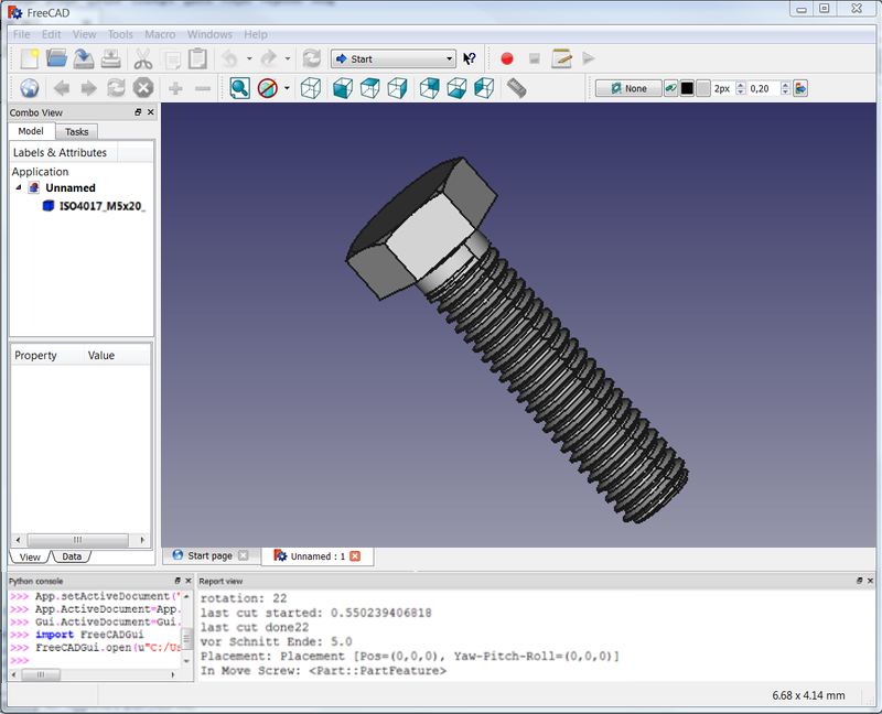 align=center|FreeCAD main window with the Report view and the Python console