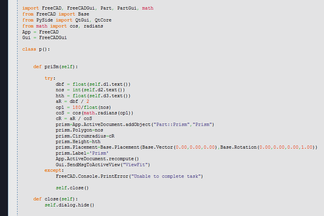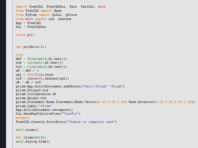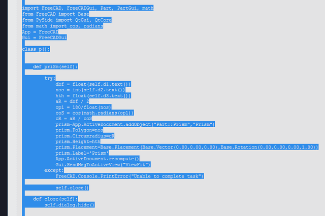 <unknown exception traceback><type 'exceptions.IndentationError'>: ('expected an indented block', ('C:/Users/d/AppData/Roaming/FreeCAD/Macro_Apothem_Based_Prism_GUI.FCMacro', 21, 3, 'def priSm(self):\n'))
