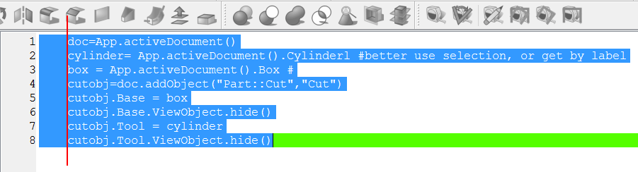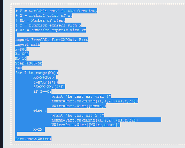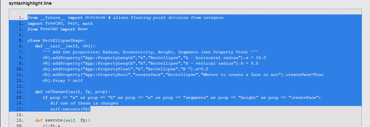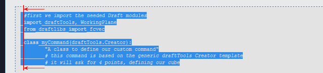 Here the selection also selects the line numbers in the code example. If this selection is pasted into the macro editor, it won\'t work. All line numbers need to be removed, and the spaces adjusted so that the Python code has the proper indentation.