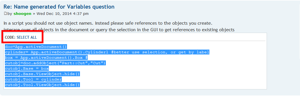 Here the code has been copied from a forum thread by using the Select all button. Apparently the selection is good.