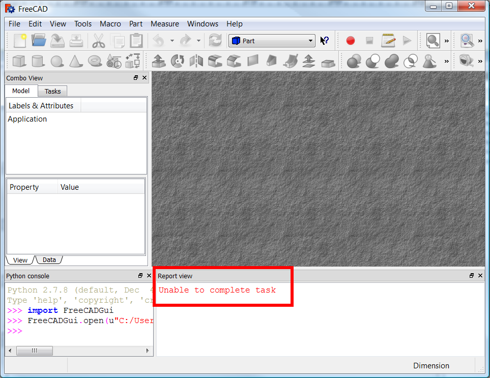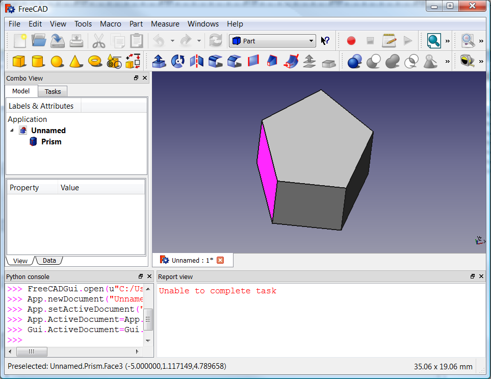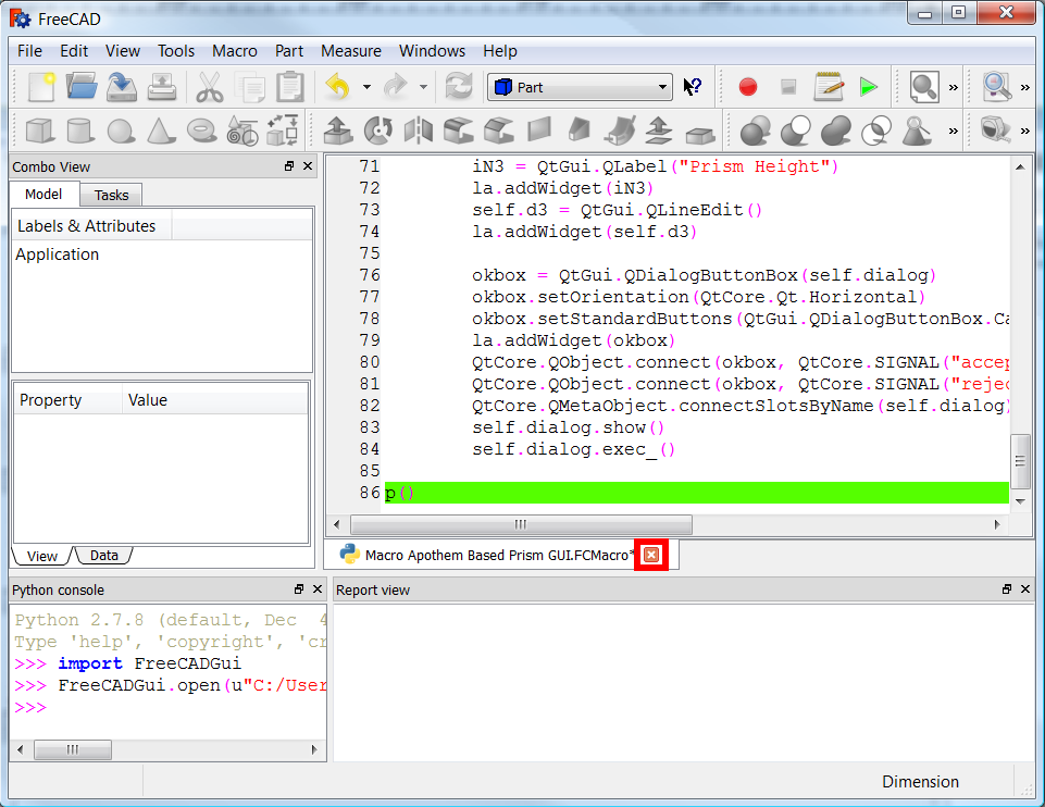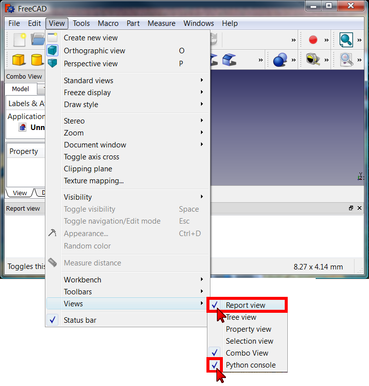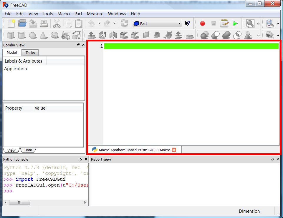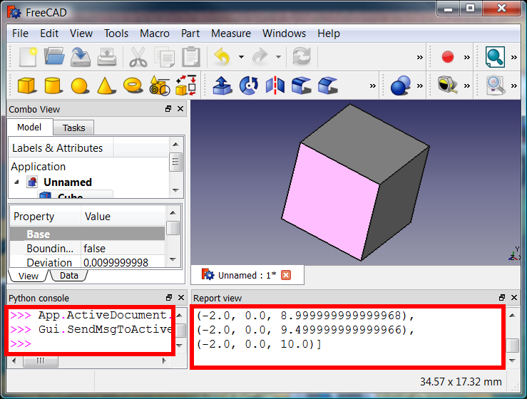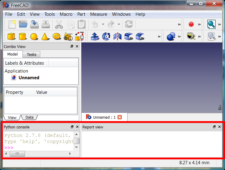 3. The panels are now visible, and commands like FreeCAD.Console.PrintMessage() now print information that appears in the Report view.