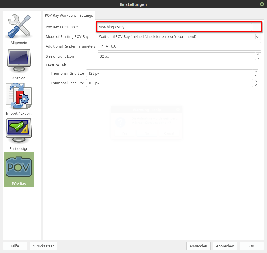 To complete the installation the path to the POV-Ray executable has to be defined in the workbench preferences, usually these are the default paths:
