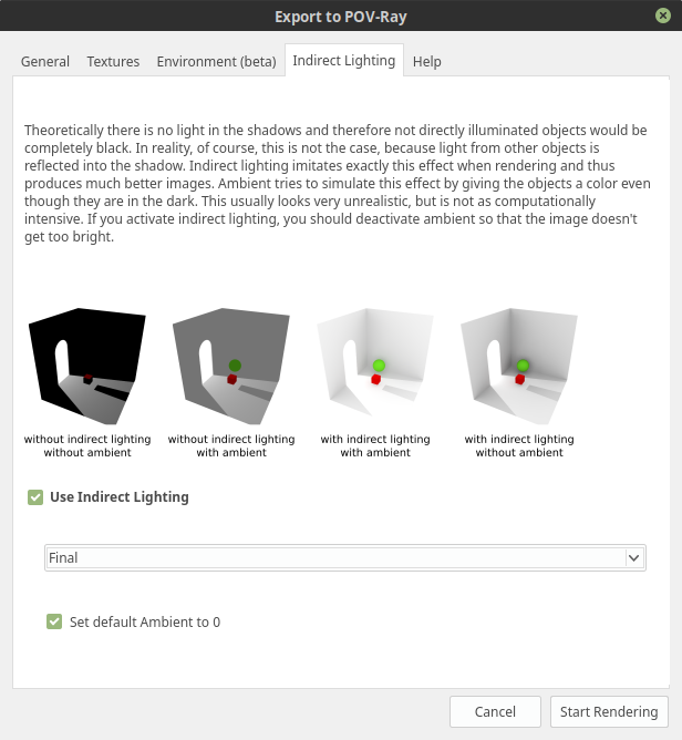 Power users who want access to all options of the POV-Ray renderer can do so by creating a special file. For more details see the Power User page on our Wiki.