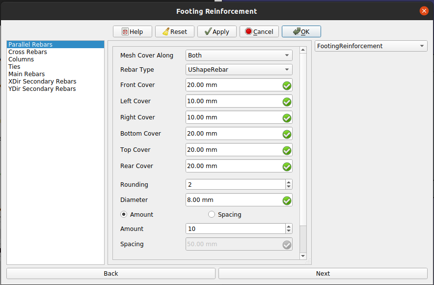 4. Select the desired rebar type and other input data for rebars in parallel direction of selected face in footing reinforcement mesh as show in below image.