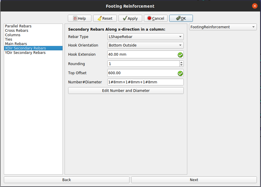 9. Click Next or click on XDir Secondary rebar in list view and fill desired input for secondary rebars in X direction in a column in footing reinforcement.