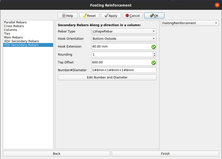 10. Click Next or click on YDir Secondary rebar in list view and fill desired input for secondary rebars in Y direction in a column in footing reinforcement.