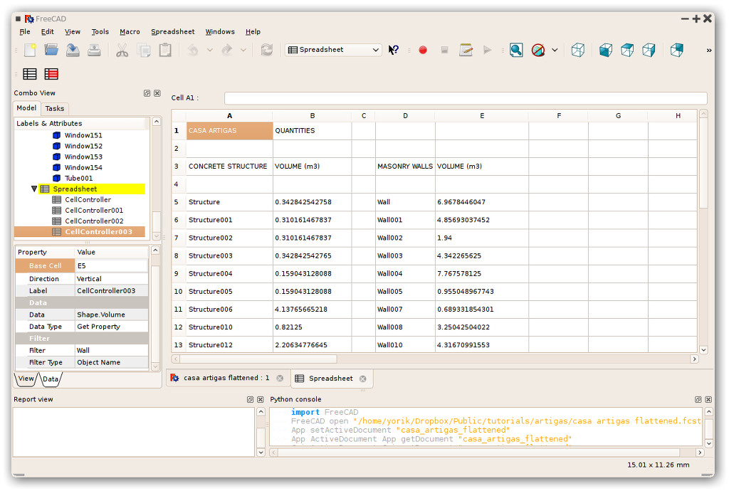 A new Spreadsheet Workbench has been added to FreeCAD. It allows you to create spreadsheet objects, that contain 2-dimensional spreadsheet data. It also features an editor so you can edit the spreadsheet contents (texts, numbers and some basic formulas are supported), and a special cell controller object, that can scan the document for certain types of objects, extract a certain property from them, and fill a certain range of cells with these values.