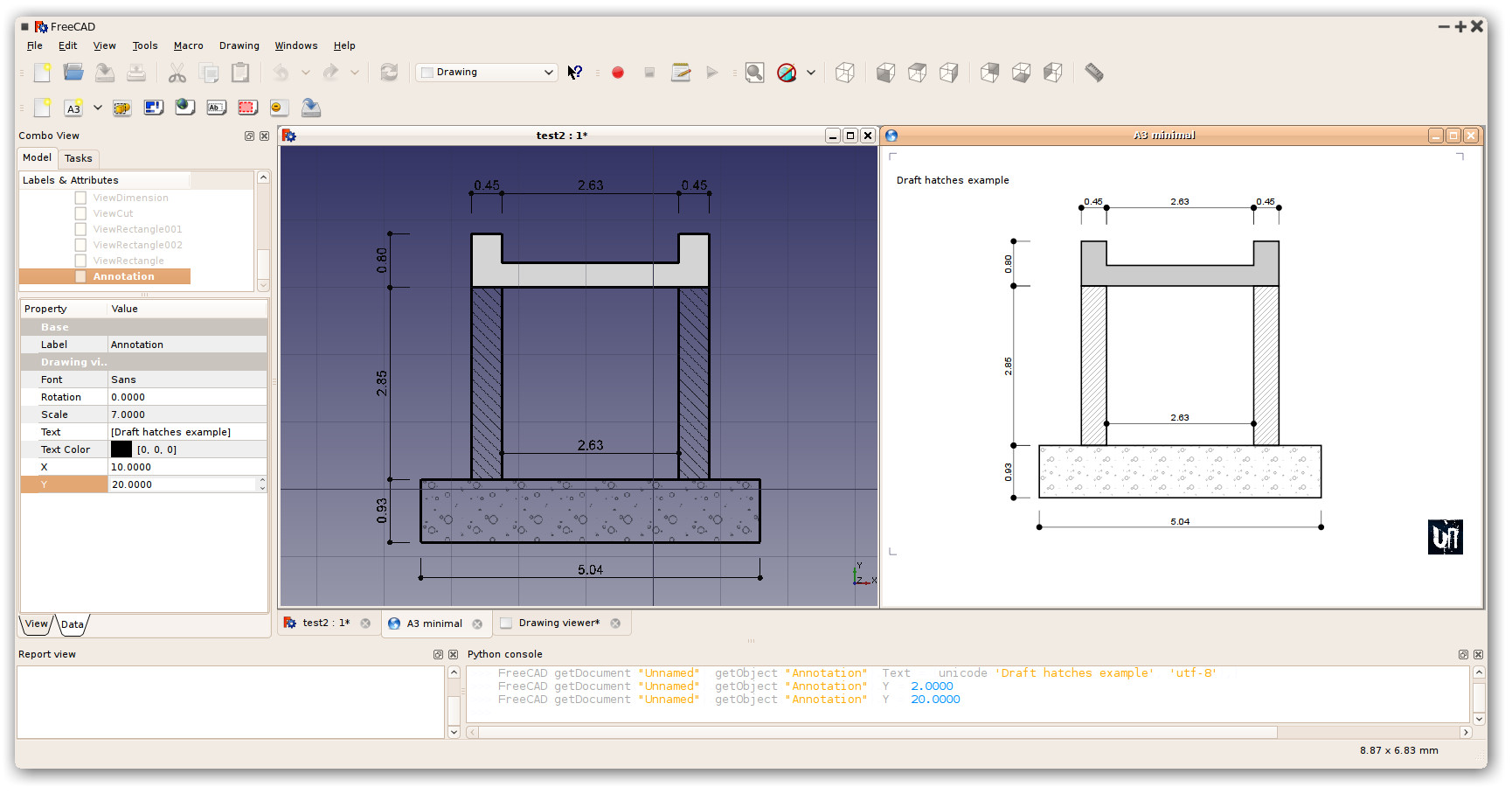 The Draft workbench also features a new toy: hatching. On specific Draft objects (those that form a closed shape such as closed polylines, rectangles, regular polygons or circles), it is now possible to apply hatching. Currently, only a couple of default hatch patterns are available, but since those patterns are very easy to create (they are simple svg files), and custom patterns can already be added by the user, the default collection might grow quickly. Draft objects with patterns are also faithfully supported by the Drawing workbench.