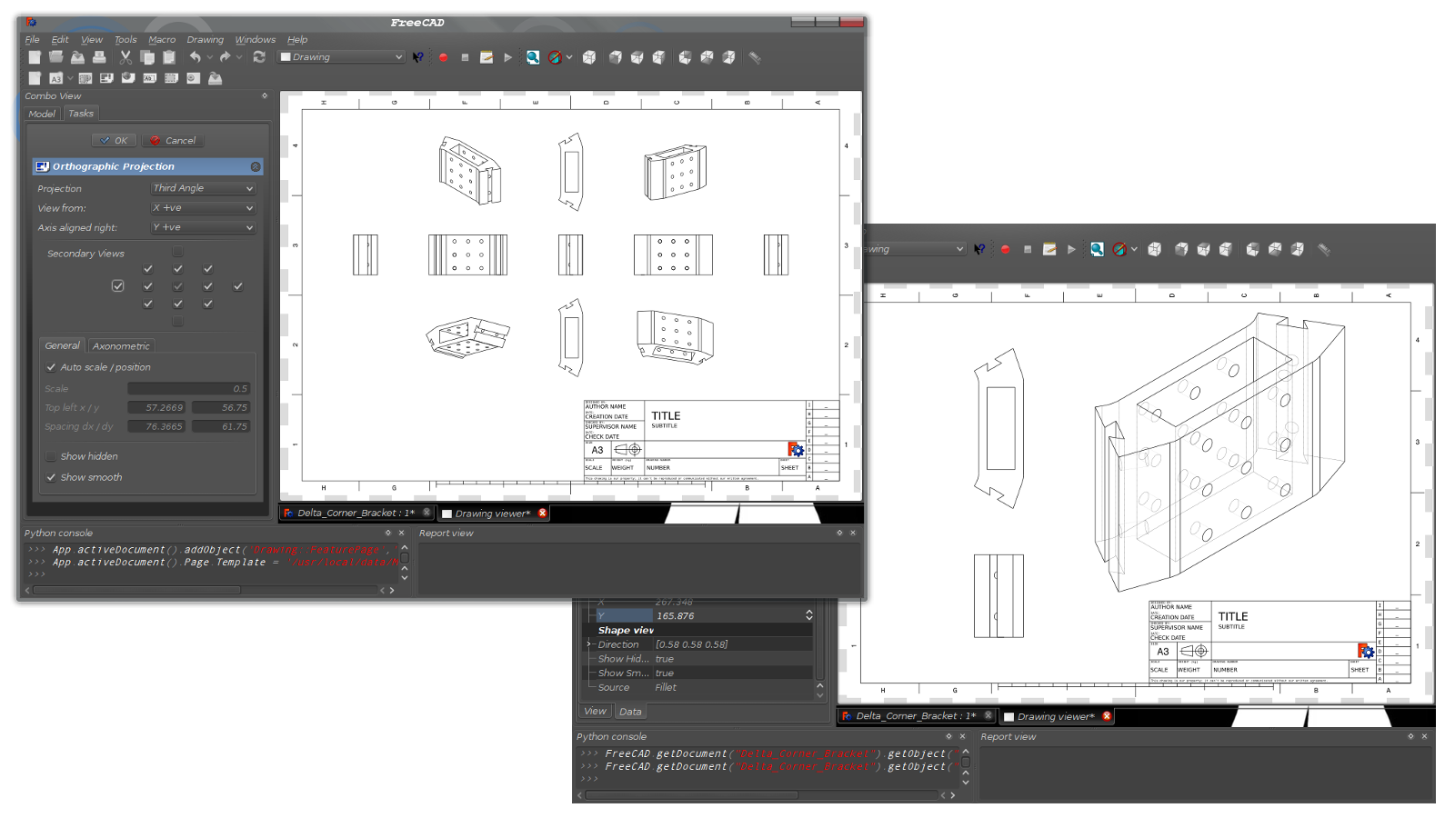 The Drawing Workbench continues to be improved with some exciting new features. Orthographic Projections now allows all views to be displayed as well as much greater control over individual views. Another key feature, Drawing Templates may now contain data defining Border and Title Block locations that will automatically confine Projections within the border while at the same time automatically avoiding the space occupied by the Title Block.
