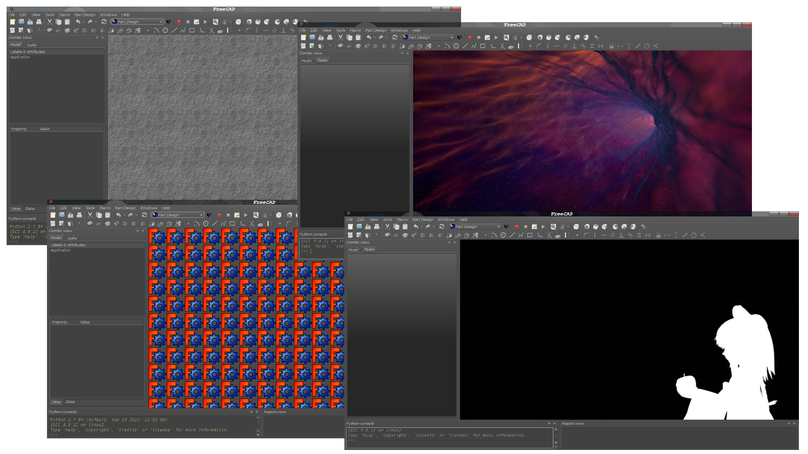 FreeCAD 0.14 becomes even more customizable with the addition of Style Sheets being used to control the background image in the main window. No longer is the user stuck with the grey stone background. Almost any image, picture or custom tile may be used to fill the background space in FreeCAD\'s main Window.