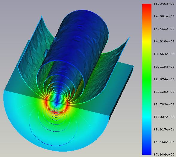 Iso-contours, depicting the y-component of the absolute magneticflux density in and around a copper wire that is flown through byelectric current at a frequency of 100 kHz.For more info about this model, see section 14 of the [Elmer Tutorials](https://www.nic.funet.fi/index/elmer/doc/ElmerTutorials.pdf). There is the new