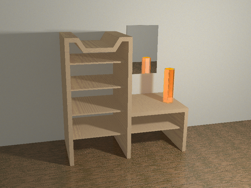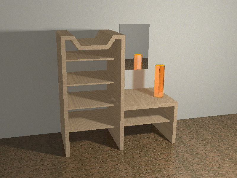 align=center|Starting from the standard template, render of the scene with POV-Ray, with the light source and sky sphere set up, materials assigned, and a floor plane with a parquet texture.